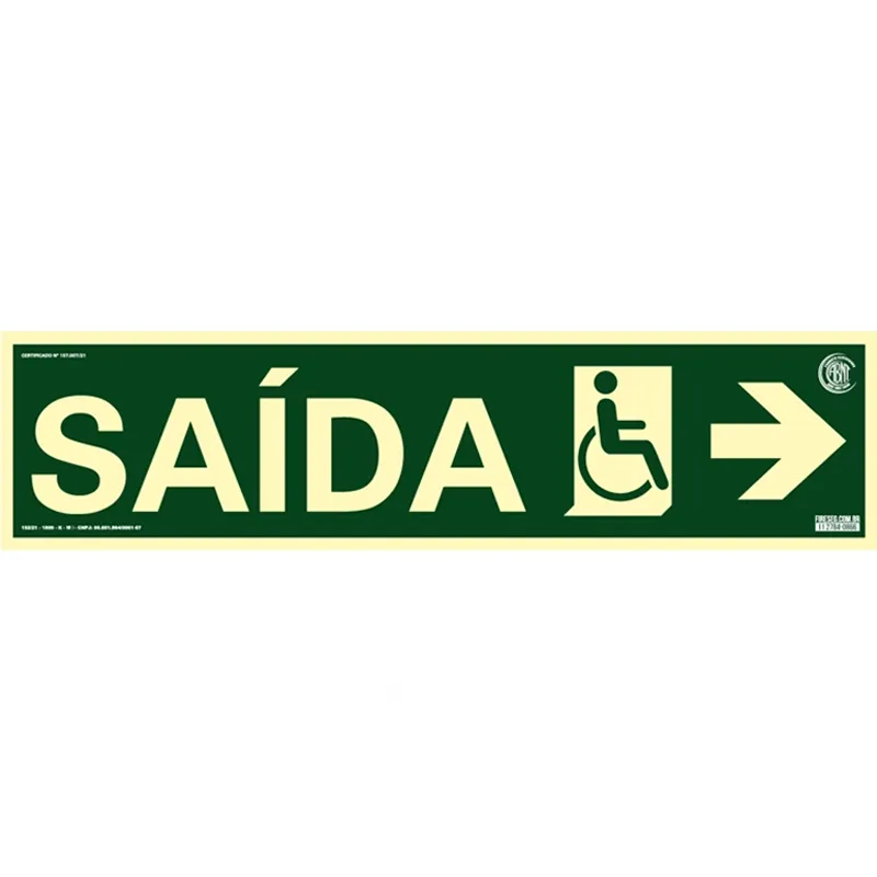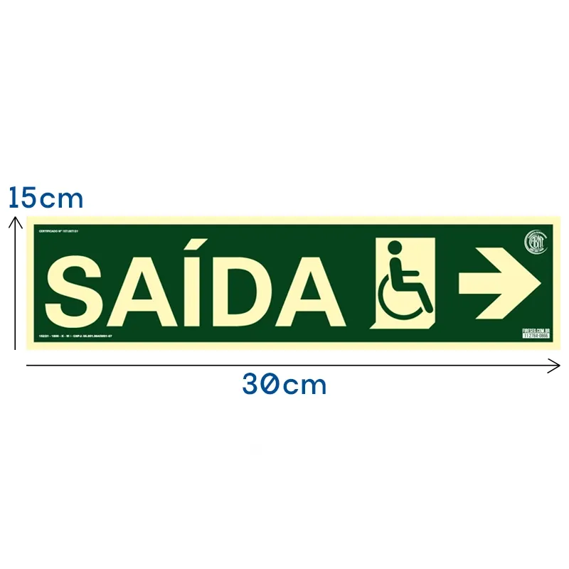 Assegure a segurança e a inclusão em seu ambiente com esta Placa de Sinalização de 30x15cm ou 40x10cm, fabricada em PVC expandido de 2mm. O modelo S16D, da Linha ABNT, é essencial para guiar de forma clara e acessível as Pessoas com Deficiência (PCD) para a rota de fuga mais segura, com a palavra SAÍDA, um pictograma de acessibilidade e uma seta para a direita.